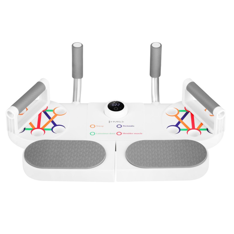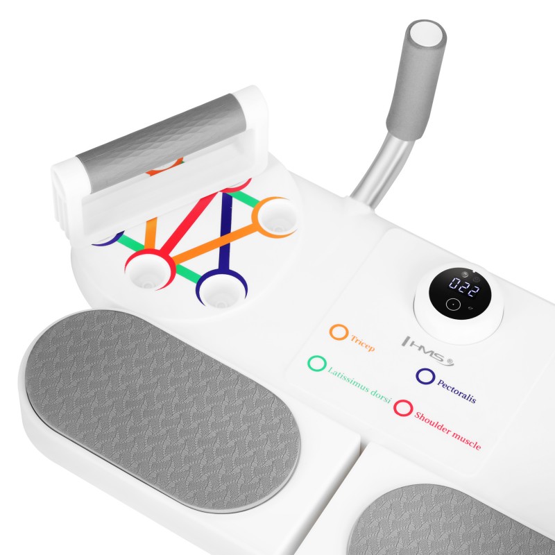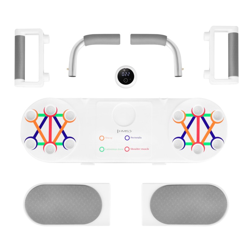 Accesoriul DBP03 HMS este un echipament compact 3-în-1 pentru antrenamente eficiente acasă, care combină placa pentru plank/abdomene, mânerele pentru flotări cu poziții multiple și un contor inteligent de repetări cu senzor optic (IR).