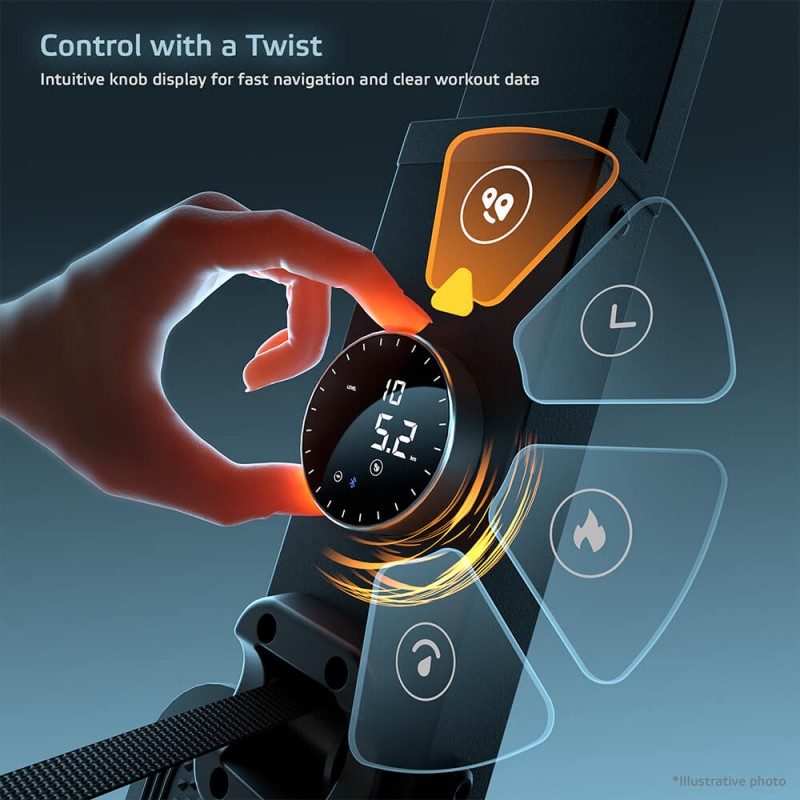 Butonul de control rotativ cu display afișează clar toate metricile cheie ale antrenamentului – ritmul vâslirilor, rezistența, numărul de vâsliri, viteza, timpul, distanța, caloriile arse și timpul per 500 m. Aparatul suportă conectivitate Bluetooth și centură toracică analogică, permițând antrenamente bazate pe ritmul cardiac și monitorizarea performanței în timp real. Cu suportul pentru tabletă, te poți bucura de filmul sau aplicația preferată în timpul antrenamentului.