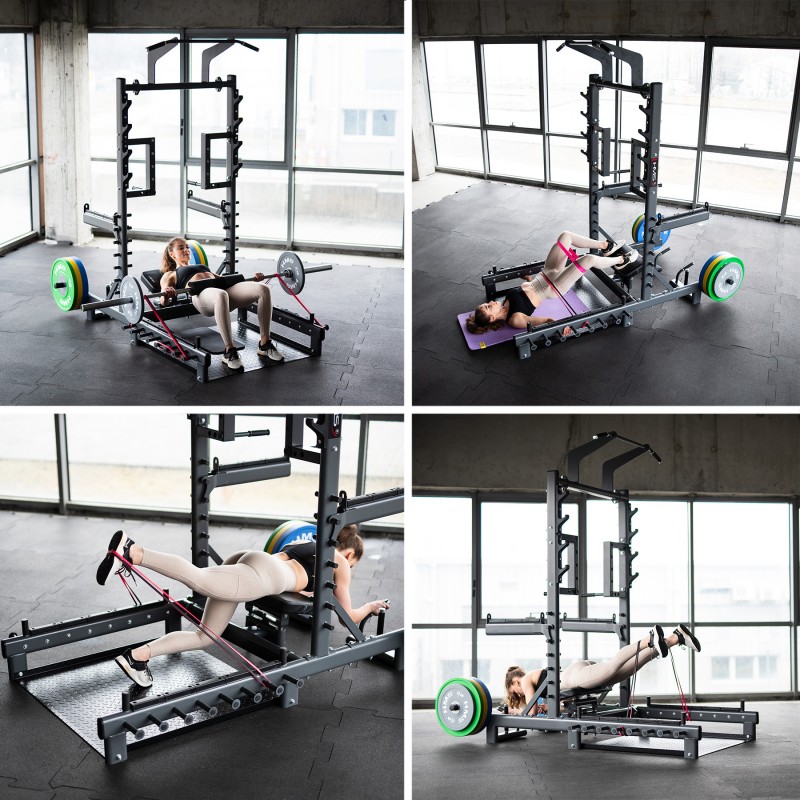 Aparatul SMP01 este noul dvs. aparat multifunctional de antrenament care nu numai că vă permite să efectuați exercitii de tip hip thrusts sau deadlift, ci a fost extins pentru a include o bară de tractiuni, mânere pentru dips și bară haltere, suporturi de siguranță și tije pentru depozitarea greutăților.