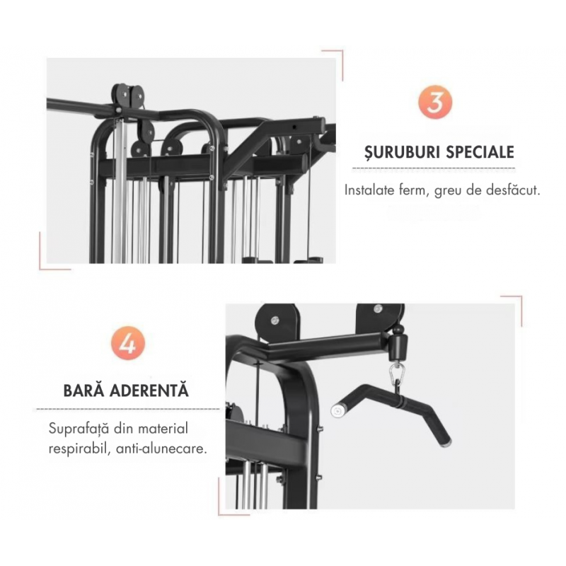 Poți folosi acest echipament pentru a antrena mai multe grupe musculare, inclusiv piept, spate, umeri, brațe.