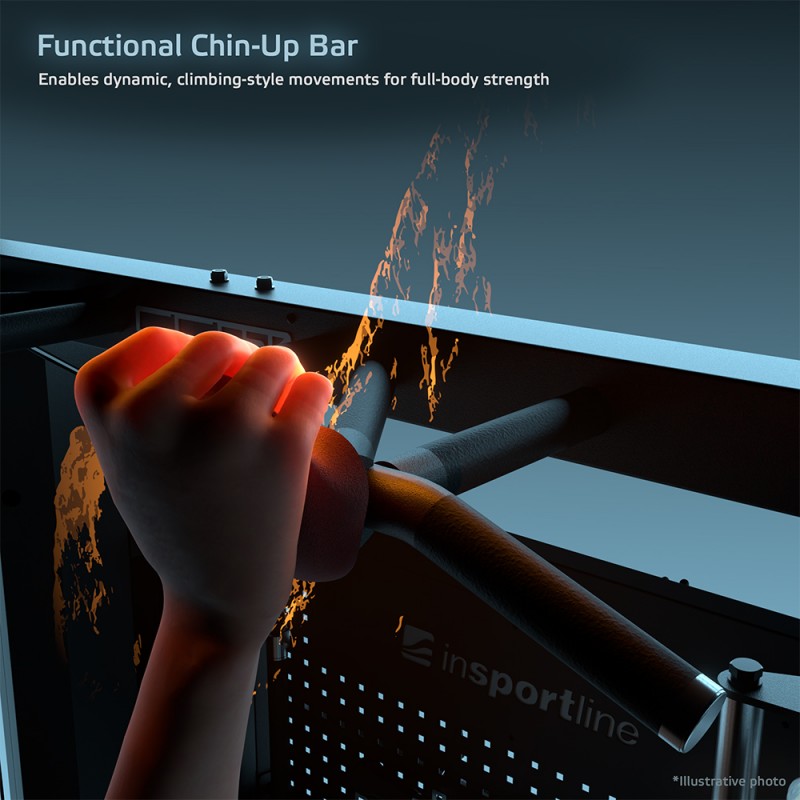 Partea frontală a stației este echipată cu o bară de tracțiuni multifuncțională, cu 6 opțiuni de prindere și o capacitate de încărcare de până la 150 kg, fiind ideală pentru tracțiuni, ramat și exerciții funcționale avansate, inclusiv variante cu prize de tip „climbing”. Panoul central perforat, de mari dimensiuni, oferă spațiu organizat pentru depozitarea accesoriilor, astfel încât mânerele, corzile și atașamentele să fie mereu la îndemână. Baza stabilă, articulația Landmine cu pivot pentru bare olimpice și punctele de ancorare pentru benzi elastice sau sisteme de suspensie extind considerabil versatilitatea aparatului.