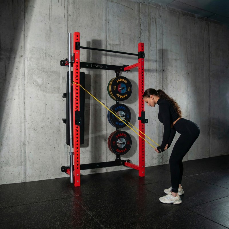 Power rack KLT34 HMS este echipat cu o bancă de antrenament pliabilă, care permite exerciții precum împins cu haltera, antrenamente cu gantere și exerciții pentru abdomen. După antrenament, banca poate fi pliată, sporind eficiența spațiului.