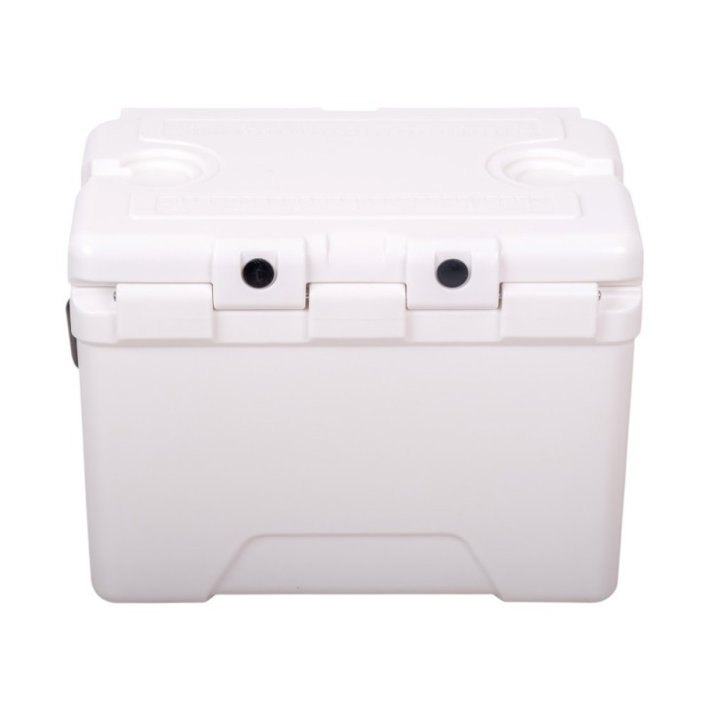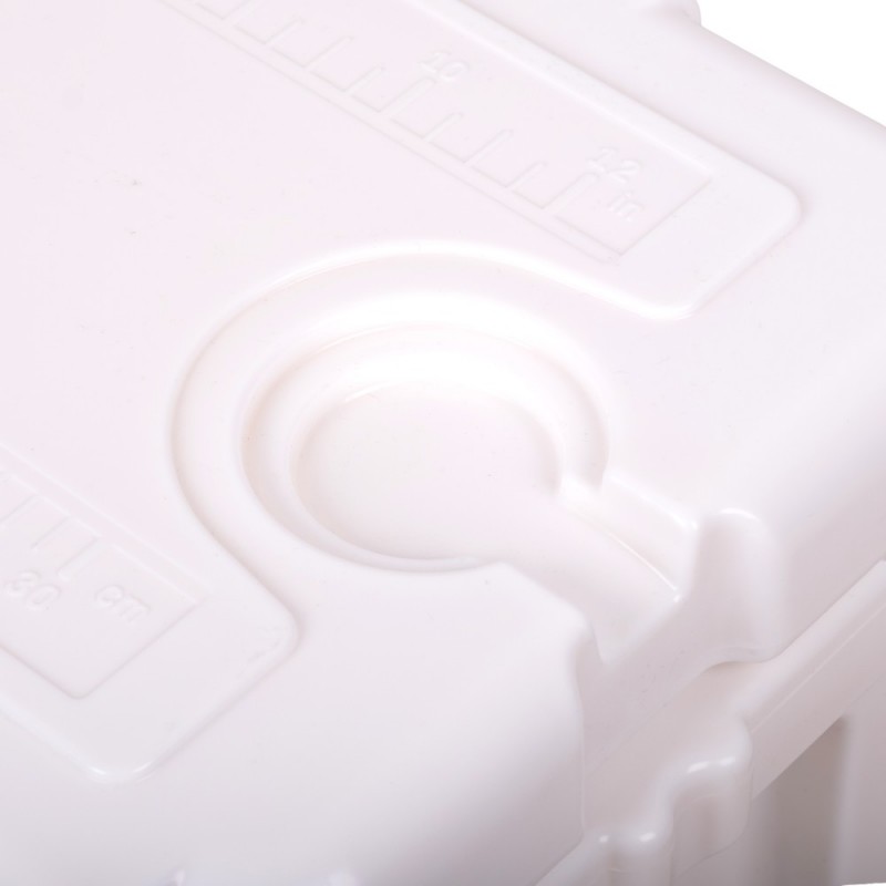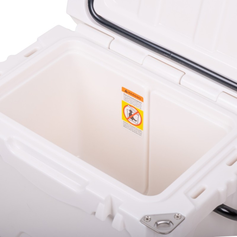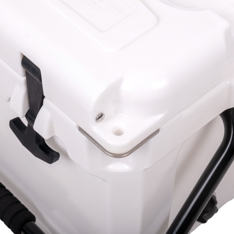 Cutia este fabricată din plastic durabil LLDPE/HDPE, fiind suficient de rezistentă pentru tratamente dure. Clemele de cauciuc asigură o închidere sigură a capacului, care include și o gradatie de măsurare a lungimii (0–30 cm), foarte utilă în timpul ieșirilor la pescuit. Alte dotări includ două deschizătoare pentru sticle, două suporturi pentru băuturi, un mâner căptușit cu spumă pentru transport facil și un dop de scurgere cu filet pentru eliminarea apei după o zi plină de gheață.