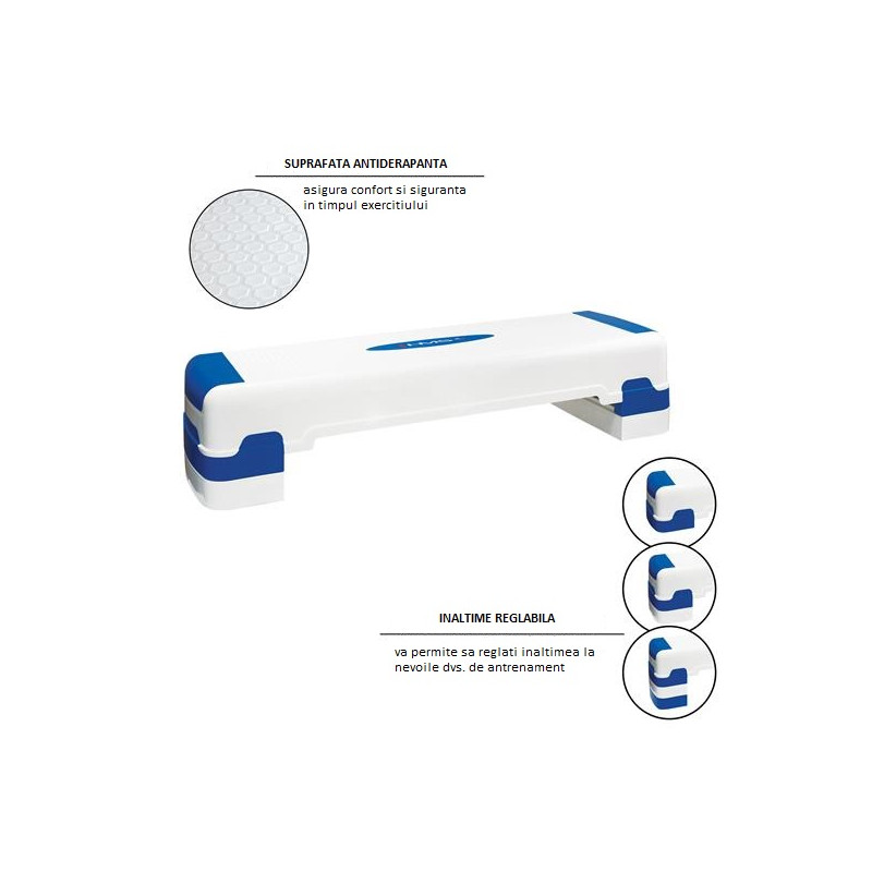 Banca Aerobic HMS AS005 Alb/Albastru este pentru exercitii de fitness si aerobic. Dispozitivul are o structura puternica si stabila care asigura confortul si siguranta antrenamentului.