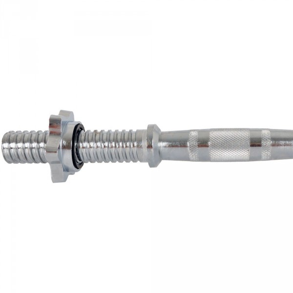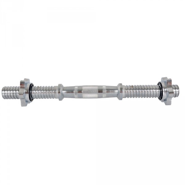 Bara universala pentru gantera, lungime 40 cm, fabricata din metal inoxidabil, doua sigurante cu filet, maner cu suprafata aderenta, greutate 2.3 kg.