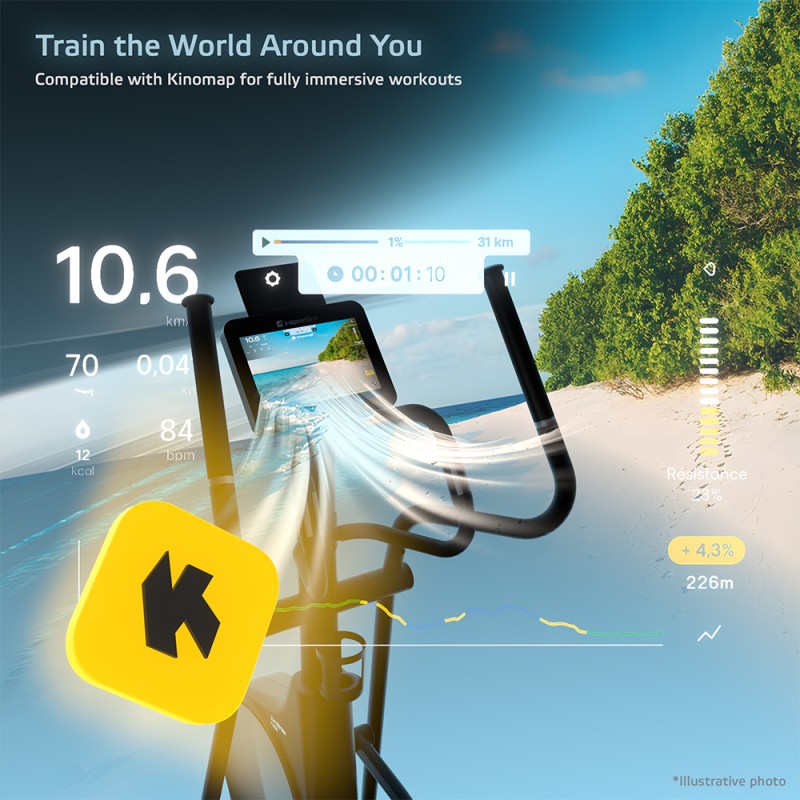 Conectează simplu bicicleta eliptică la aplicație și pornește pe trasee virtuale din întreaga lume. Kinomap și Zwift ajustează automat rezistența în funcție de profilul traseului – simți urcușurile și te bucuri la maximum de drumurile drepte. Ambele aplicații oferă medii imersive, antrenamente realiste sau posibilitatea de a concura cu alți sportivi. Dacă preferi ceva mai simplu, FitShow oferă antrenamente interactive și ajustează automat rezistența în funcție de diferența de nivel. Rezultatul este un antrenament realist care te distrează și te motivează în același timp.