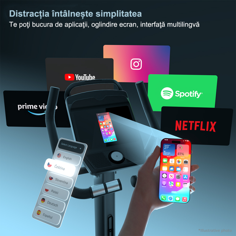 Consola inteligentă aduce o nouă dimensiune antrenamentelor de acasă. Suportă screen mirroring pentru mobil, opțiuni de limbă în cehă, slovacă și poloneză, precum și aplicații de divertisment care transformă antrenamentul într-o experiență plăcută. Poți conecta și căști Bluetooth pentru a urmări Netflix sau YouTube fără să-i deranjezi pe ceilalți – doar începi să pedalezi și emisiunea preferată rulează alături de tine!