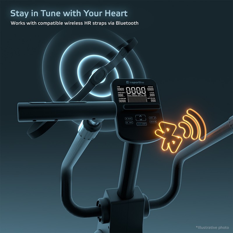 Ecranul mare, ușor de citit, afișează toate datele esențiale — timp, distanță, viteză, calorii și puls. Poți măsura ritmul cardiac prin senzorii integrați din mânere sau cu ajutorul unei benzi toracice Bluetooth (neinclusă). Bicicleta oferă, de asemenea, programe HRC și WATT, test de fitness și funcție de măsurare a procentului de grăsime corporală.