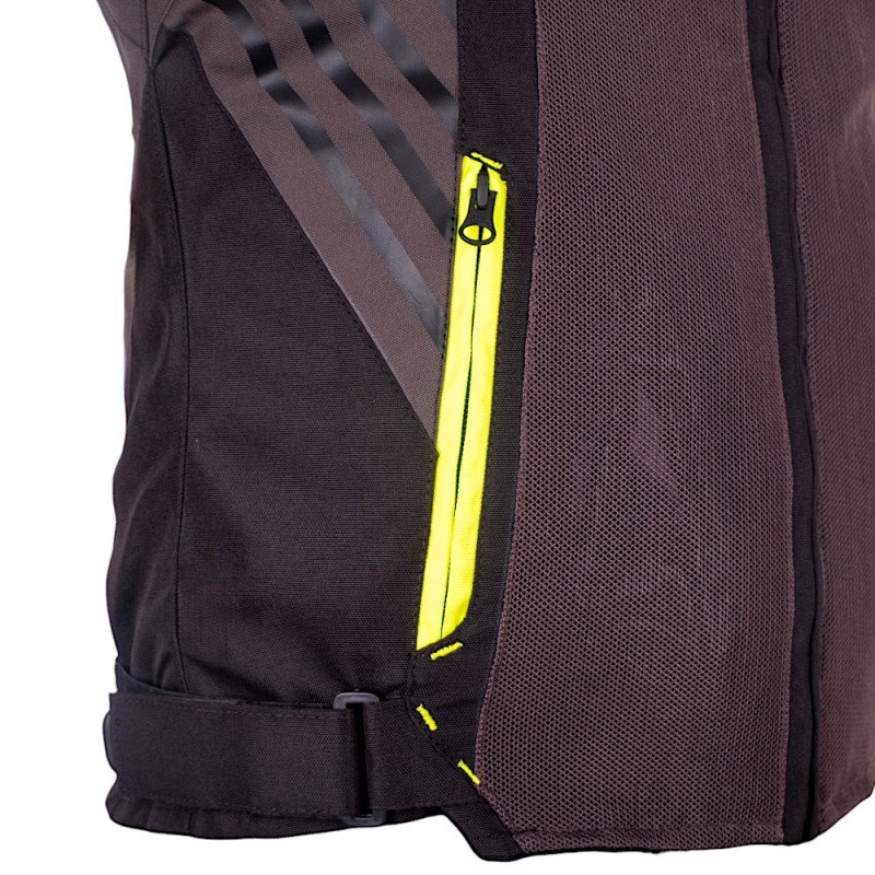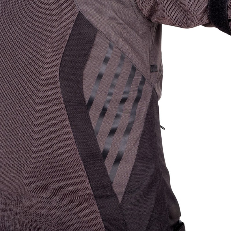 Geaca este dotată cu protecții certificate detașabile la coate și umeri, pentru un plus de siguranță. Este confecționată din poliester durabil 600D, iar căptușeala interioară din plasă asigură respirabilitate și promovează circulația aerului în interiorul hainei. Poate fi echipată și cu o membrană impermeabilă detașabilă, ideală în caz de ploaie.