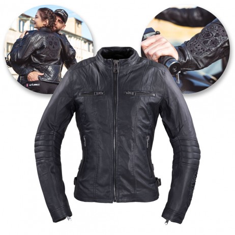 Daca sunteti in cautarea unei jachete de motocicleta sigure si confortabile, care nu numai ca arata foarte bine, dar va permite sa va aratati curbele, atunci Geaca Moto de Piele pentru Femei W-TEC Strass este potrivita pentru dumneavoastra! Aceasta combina pielea de oaie moale si maleabila cu un petice decorativ de neratat in forma de craniu. Exista un petic mare "santa muerte" pe spate si un altul, mai mic, pe maneca stanga. Mai mult, peticele sunt captusite cu pietre decorative de cristal, ceea ce face ca jacheta sa aiba un aspect unic!
