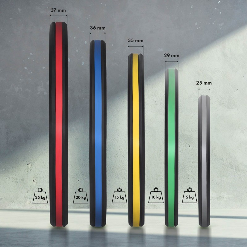 Marcajele clare ale greutății și culorile conforme cu standardele internaționale permit o selecție rapidă și ușoară a încărcăturii potrivite în timpul antrenamentului.
