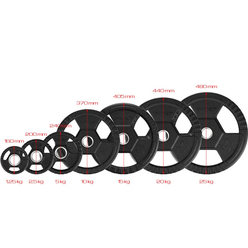 Discul HMS TOH este special conceput pentru barele olimpice si este fabricat din otel rezistent. Stratul exterior este realizat din cauciuc, care nu numai ca este usor de curatat, dar, de asemenea, absoarbe bine socurile in caz de impact. Astfel, protejeaza suprafata impotriva deteriorarii si reduce zgomotul. Pe langa calitatile estetice, discul are avantajul ca este ergonomic. Cele trei manere ale sale permit o schimbare rapida si confortabila a greutatii pe bara. In plus, pot fi folosite fara bara, ca alternativa la gantere.