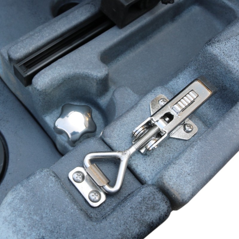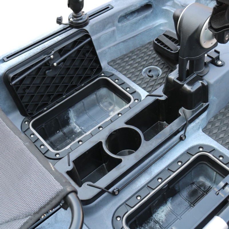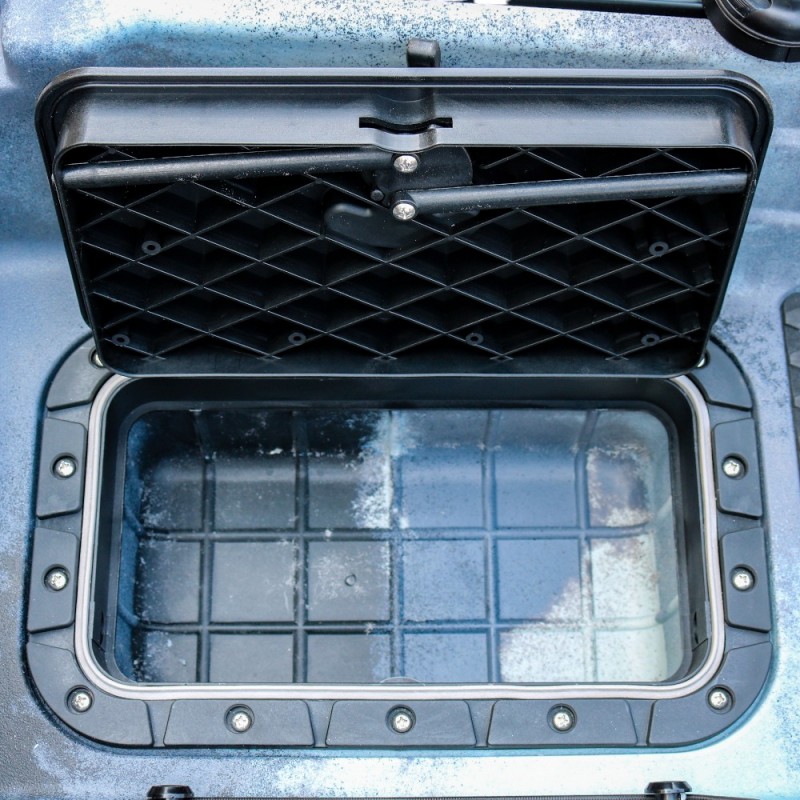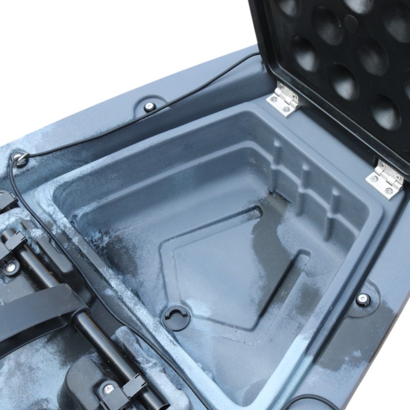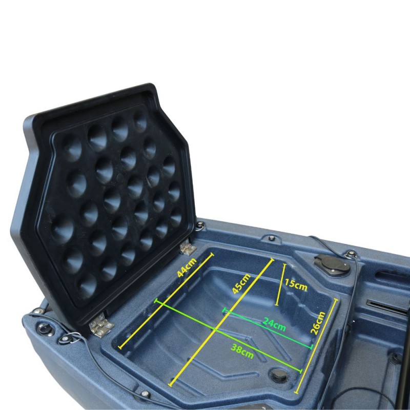 Datorită construcției ingenioase din două piese, îl poți pune ușor în mașină sau depozita în pivniță. Scaunul este confortabil și se poate plia sau scoate complet — în funcție de cât spațiu vrei pentru echipamente. Dispune de mai multe compartimente de depozitare impermeabile — în față, în spate și două cutii în mijloc — unde poți pune de la gustări până la echipamente nautice serioase sau chiar pește viu. Datorită protecției UV, soarele poate străluci cât vrea — materialul rezistă și nu crapă.