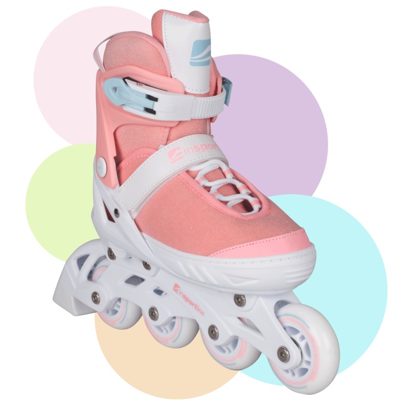 Role in linie reglabile în funcție de mărime, cu insigne vesele, sistem de fixare combinat și frână detașabilă.