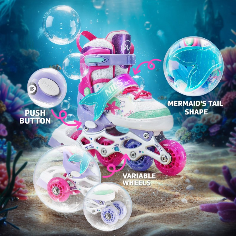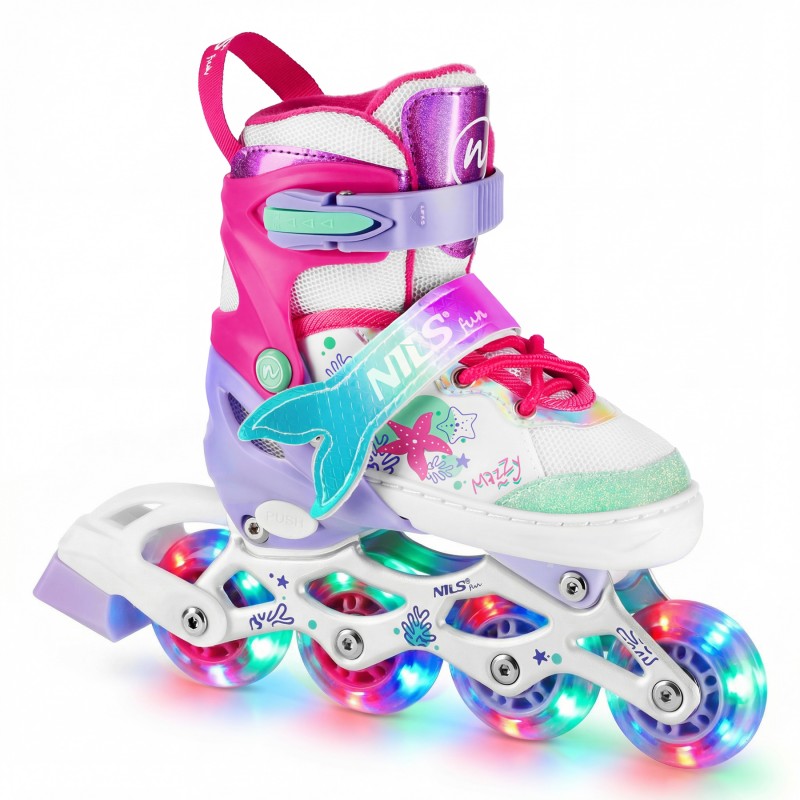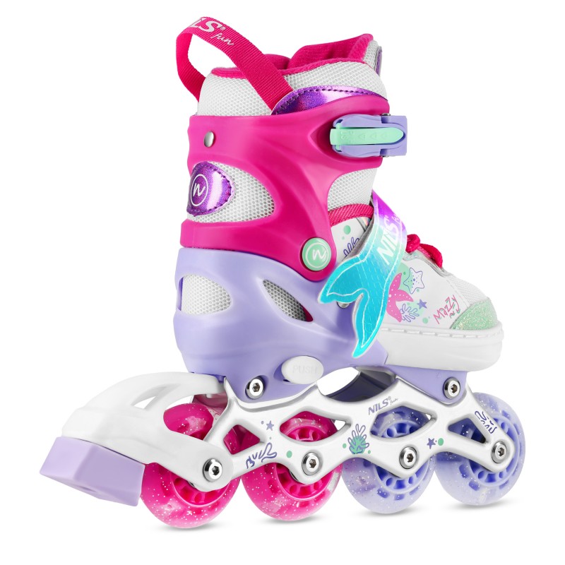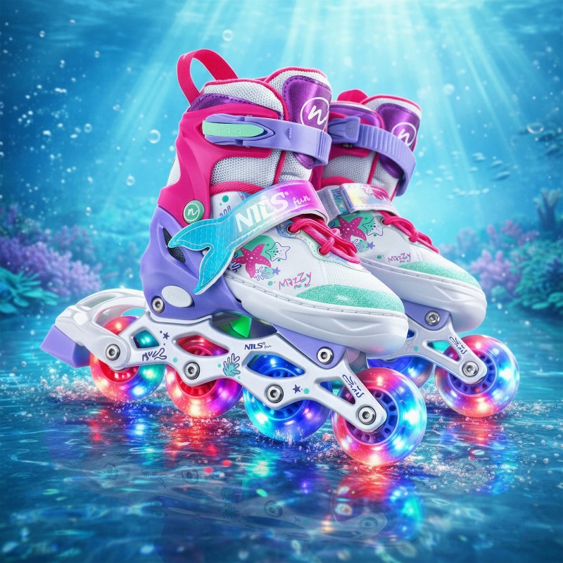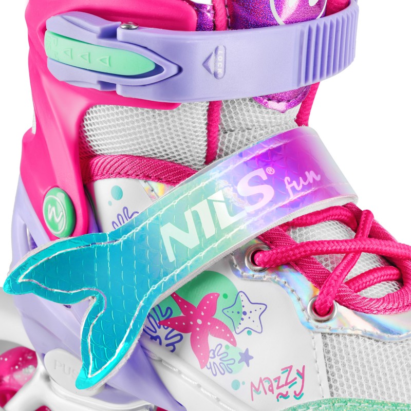 Rolele reglabile 4in1 MAZZY, NILS FUN NH18150 sunt un set unic 4 în 1, care combină funcționalitatea, siguranța și un design atractiv, de poveste, inspirat din lumea subacvatică. Modelul a fost conceput pentru copii și tineri utilizatori care vor să rămână activi pe tot parcursul anului, evidențiindu-se în același timp prin stilul lor. Un singur produs oferă patru configurații – role clasice, patine de gheață, roller-quad si 2+1+1 – fiind potrivit atât pentru sezonul de iarnă, cât și pentru cel de vară.