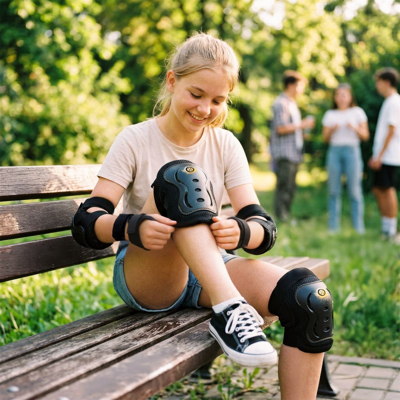 Datorită sistemului de fixare cu velcro și a curelelor elastice, protectiile se mulează bine pe corp și rămân bine fixate în timpul mișcării. Această soluție asigură confort și libertate de mișcare în timpul mersului.