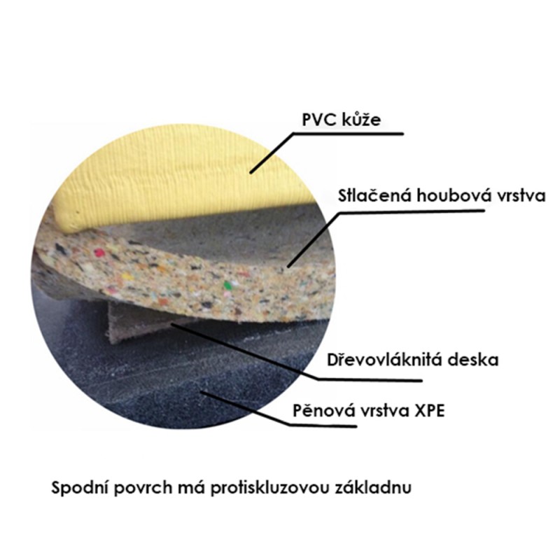 Material: piele sintetică (cu textură de tip „grăunțe de orez” pentru aderență fermă și mișcare ușoară pe saltea), strat de burete comprimat (cu efect ridicat de absorbție, dar suficient de ferm pentru a nu afecta stabilitatea), strat intermediar din fibră de lemn (previne deformarea cauzată de expansiune/contracție în urma căzăturilor repetate), strat inferior din spumă XPE (asigură amortizare optimă și distribuie uniform greutatea)