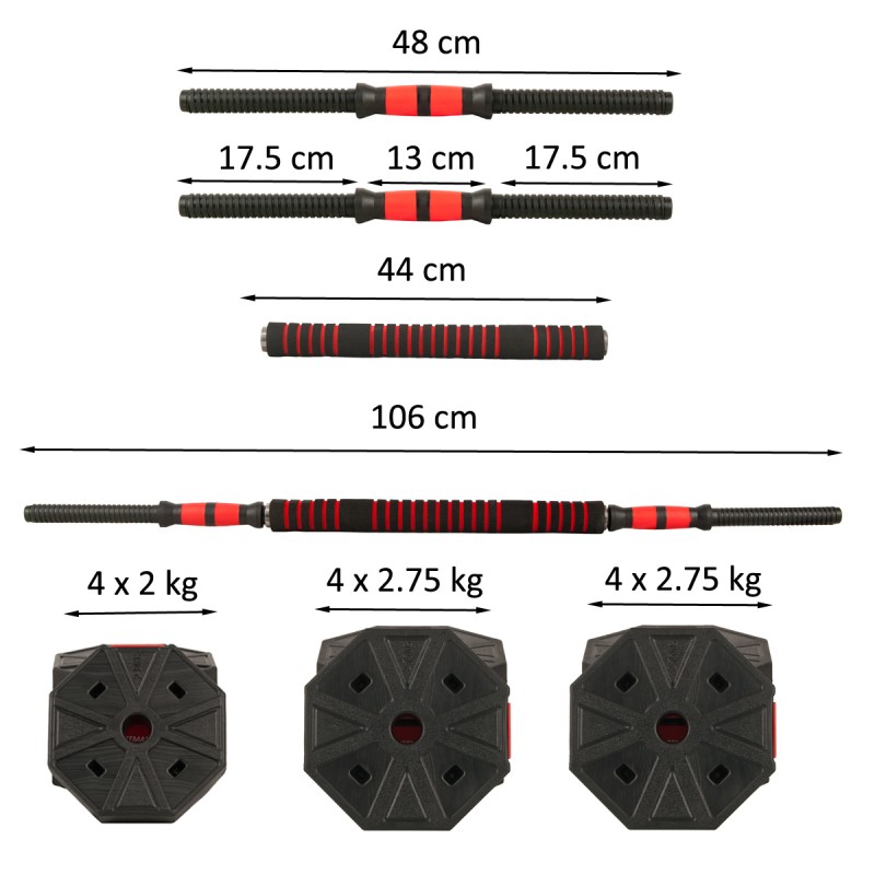 Datorita unei bare de legatura speciale, obtinem posibilitatea de a uni doua bare scurte, formand una lunga. Aceasta solutie inovatoare extinde semnificativ gama de posibilitati de antrenament. Obtinem o haltera, cu care putem face exercitii imposibil sau incomod de realizat cu ganterele. Alegand un produs, obtineti 2 modalitati de utilizare.