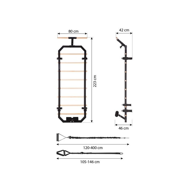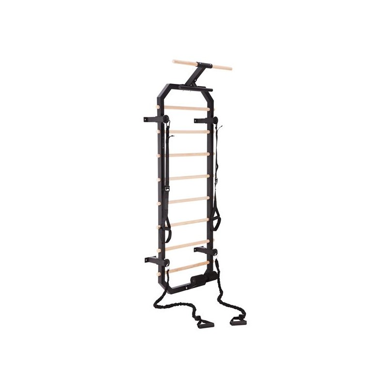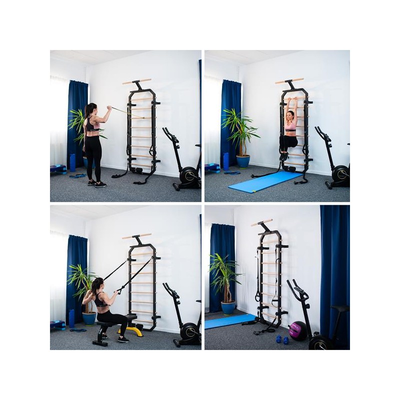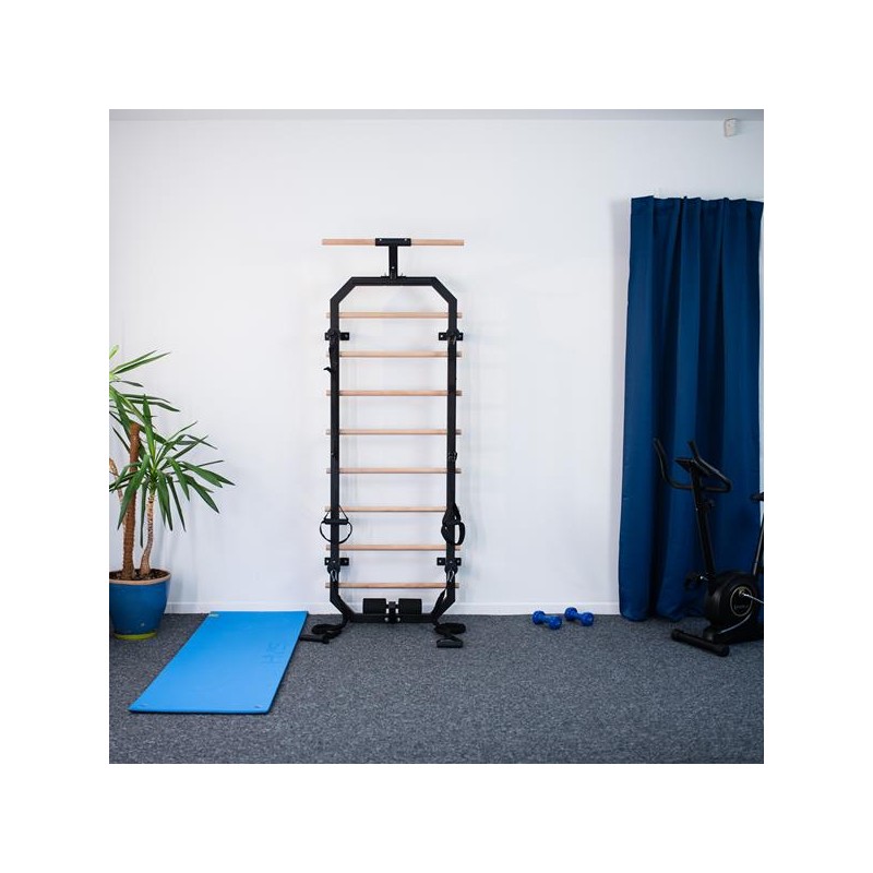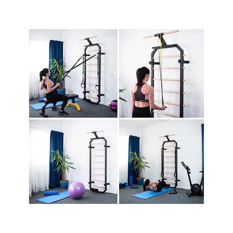 Scara multifuncțională DW2708 este o soluție ideală pentru persoanele care doresc să se antreneze acasă. Setul constă într-o scară gimnastică care se fixează pe perete, precum și în benzi și elastice speciale. Produsul este fabricat din oțel de înaltă calitate și are 8 trepte realizate din lemn de fag. Scara are o înălțime de 223 cm și o lățime de 80 cm, astfel încât orice persoană poate să se antreneze pe ea.