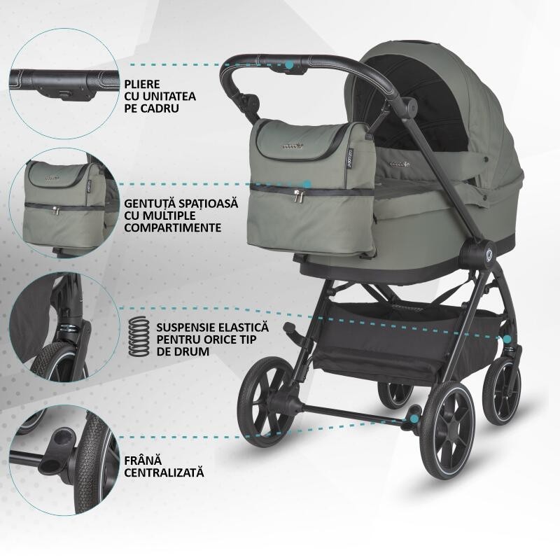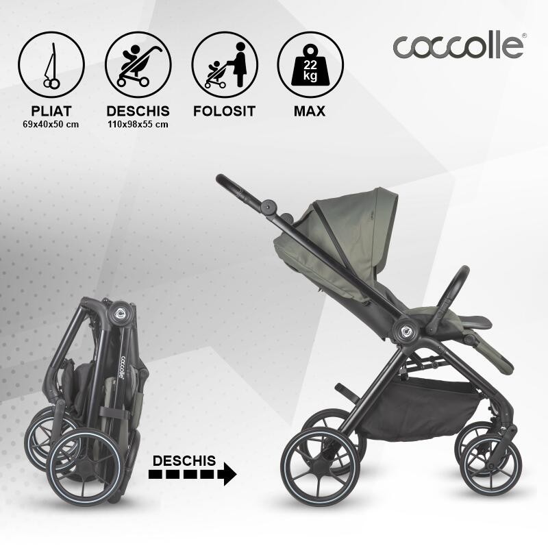 Cărucior modular 2in1 Coccolle Serry: landou + unitate sport (pe același șasiu) + accesorii incluse (huse picioare, geantă mamici, adaptoare scoică, pad).